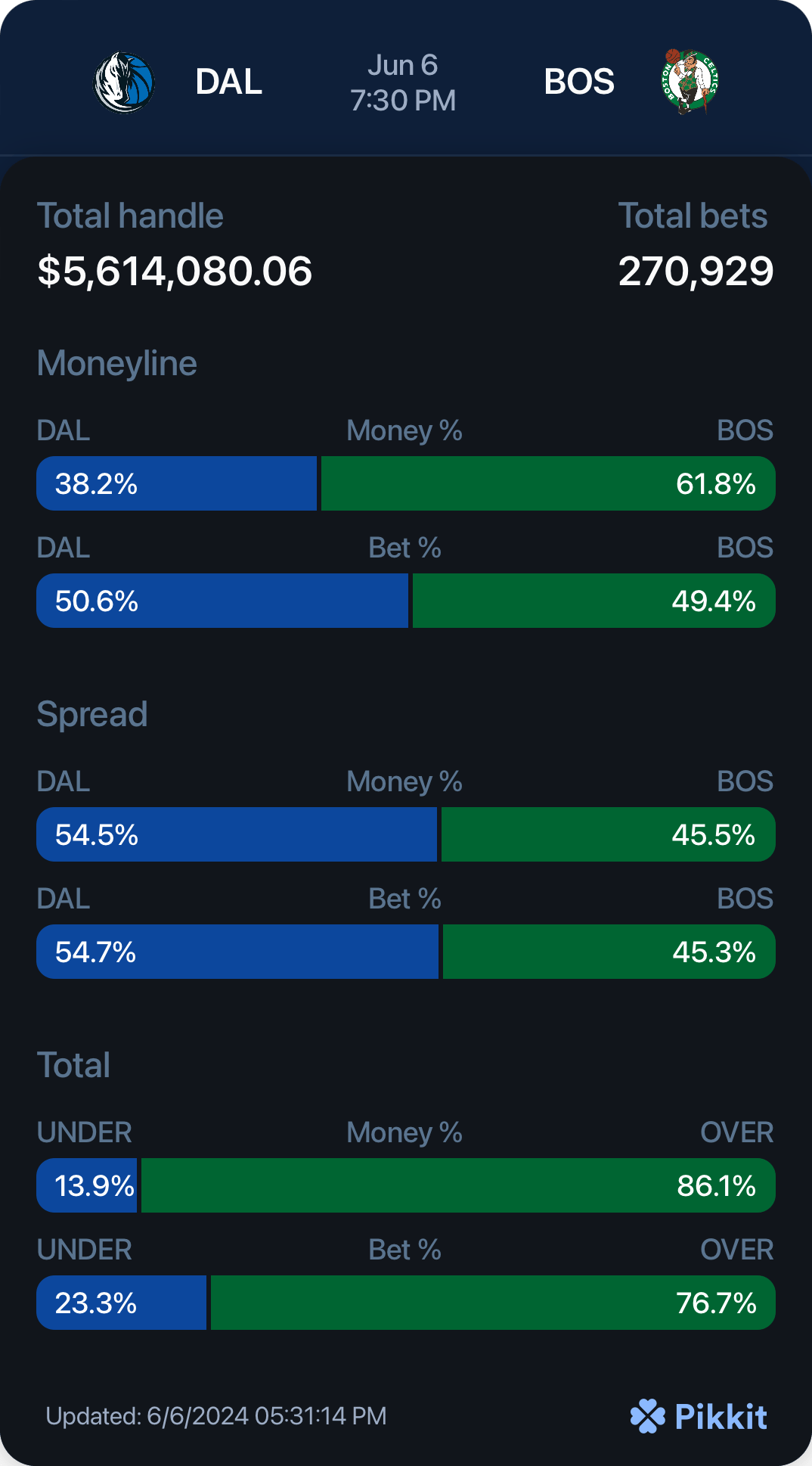 The Pikkit community is backing Dallas to cover the spread while the majority of the money is on Boston to take Game 1. Over 86% of the money is also on the OVER of the game total. Which side you backing tonight?!